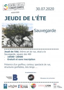 Les jeudis de l’été sont initiés par le centre social de la Sauvegarde avec le soutien de la Mission Duchère, la commission développement durable, le centre social Plateau, la MJC, le foyer protestant, la maison de l’enfance, les éducateurs de prévention, la bibliothèque, le conseil citoyen, et les compagnies Hallet-Eghayan et Le Lien théâtre.