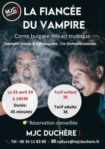 La princesse, Ina rêve d’aventures. Le mariage lui semble la seule issue pour quitter son palais et découvrir le monde. Mais rien ne se passe comme prévu ! La Fiancée du Vampire nous livre le voyage d’une héroïne prête à apprendre à piloter son destin de femme. Les polyphonies envoutantes des Balkans sont au cœur de ce spectacle rythmé par l’espièglerie des conteuses.