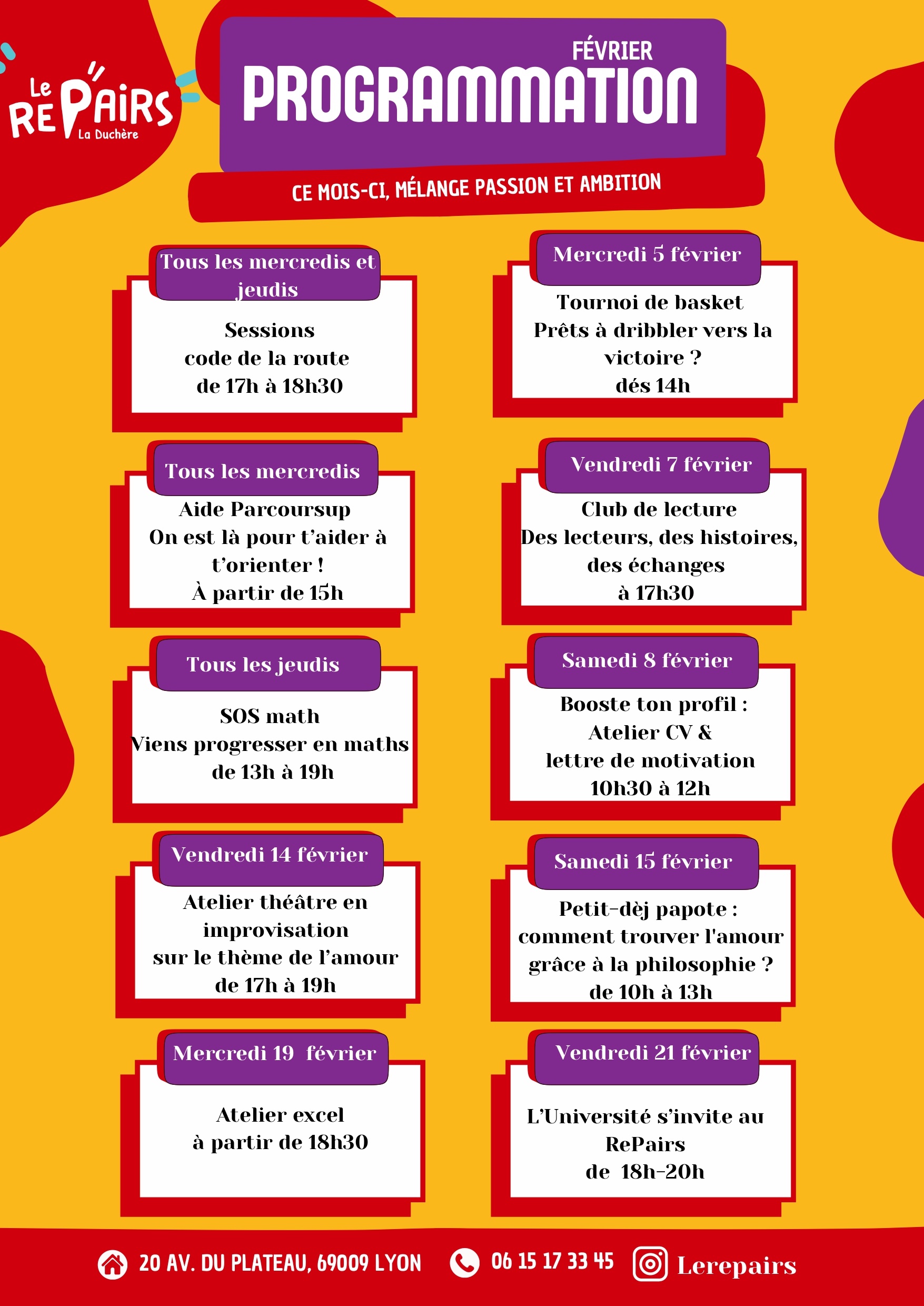 Nous sommes ravis de vous présenter la programmation de février au RePairs ! Ce mois-ci, de nombreux ateliers et événements vous attendent pour mélanger passion et ambition.