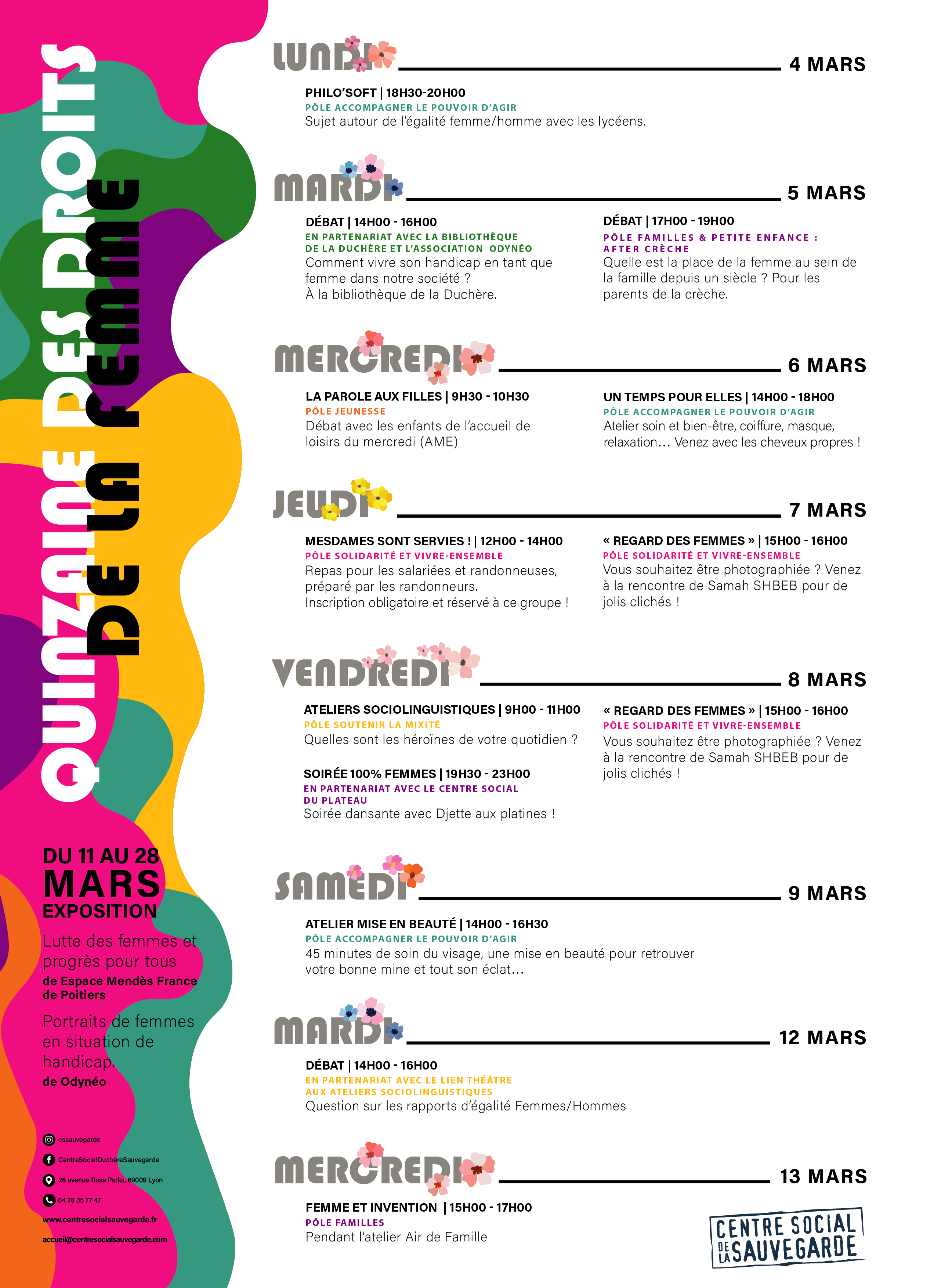 Du 4 mars au 13 mars, c’est la quinzaine des droits de la femme au Centre Social Sauvegarde ! Elle sera notamment consacrée à la lutte contre les discriminations faites aux femmes.