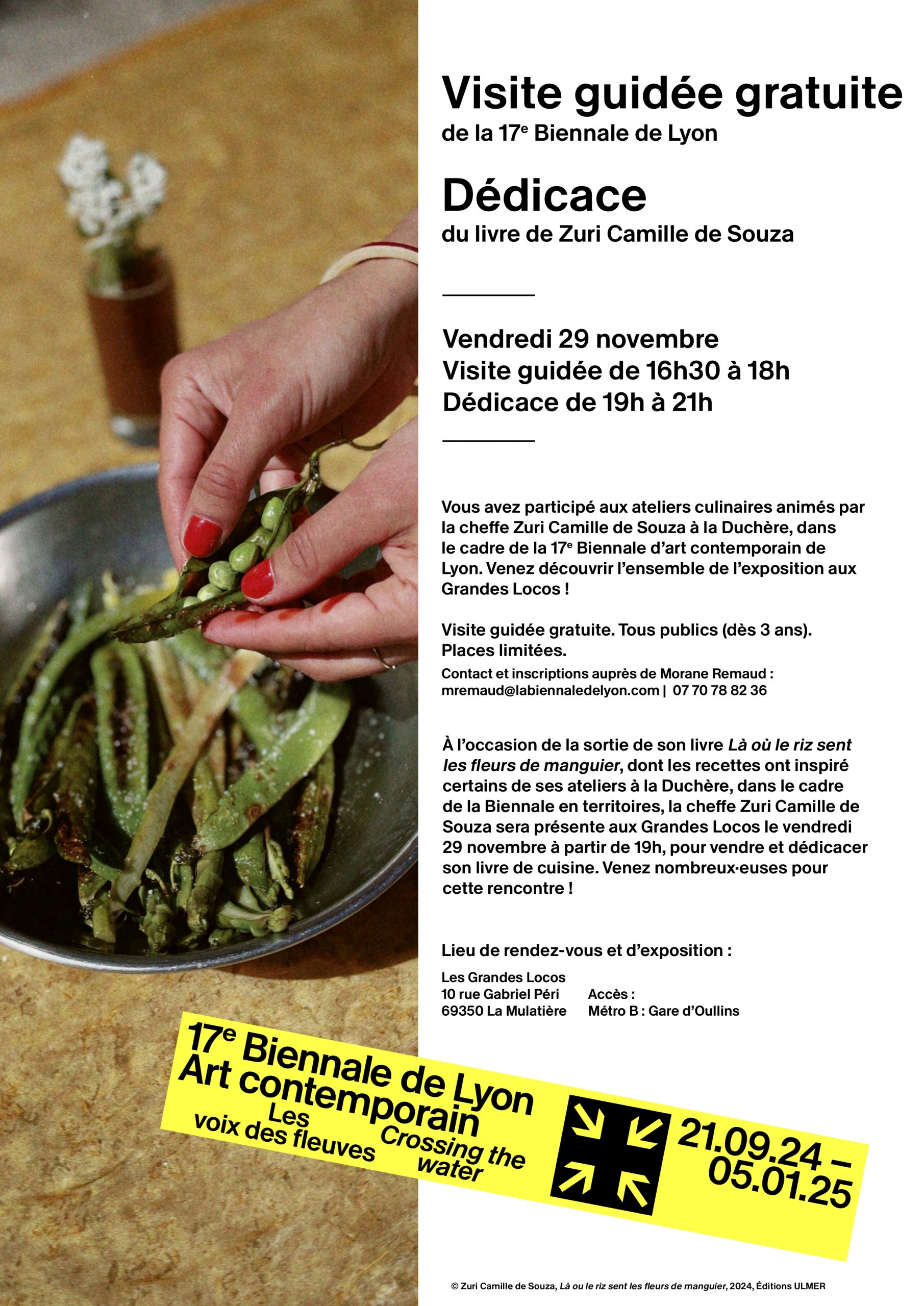 Découvrez les œuvres de la Biennale d’art contemporain et explorez les créations en lien avec les ateliers menés à La Duchère. La visite sera animée par Morane Remaud, médiatrice culturelle. (Places limitées – Réservation nécessaire via les coordonnées mentionnées sur l’affiche ci-dessous). - 19h – 21h : Dédicace du livre de Zuri Camille de Souza
